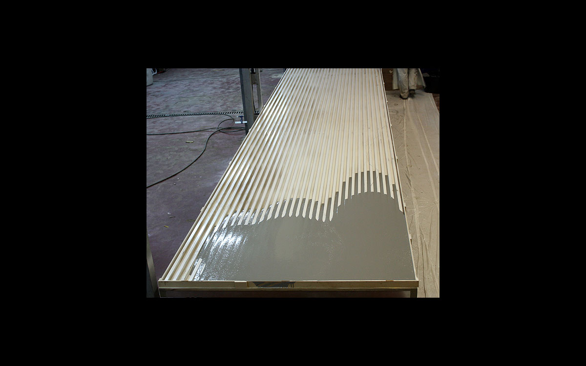 Colocación de la matriz de 12 x 2,4 m. sobre la mesa de prefabricación.