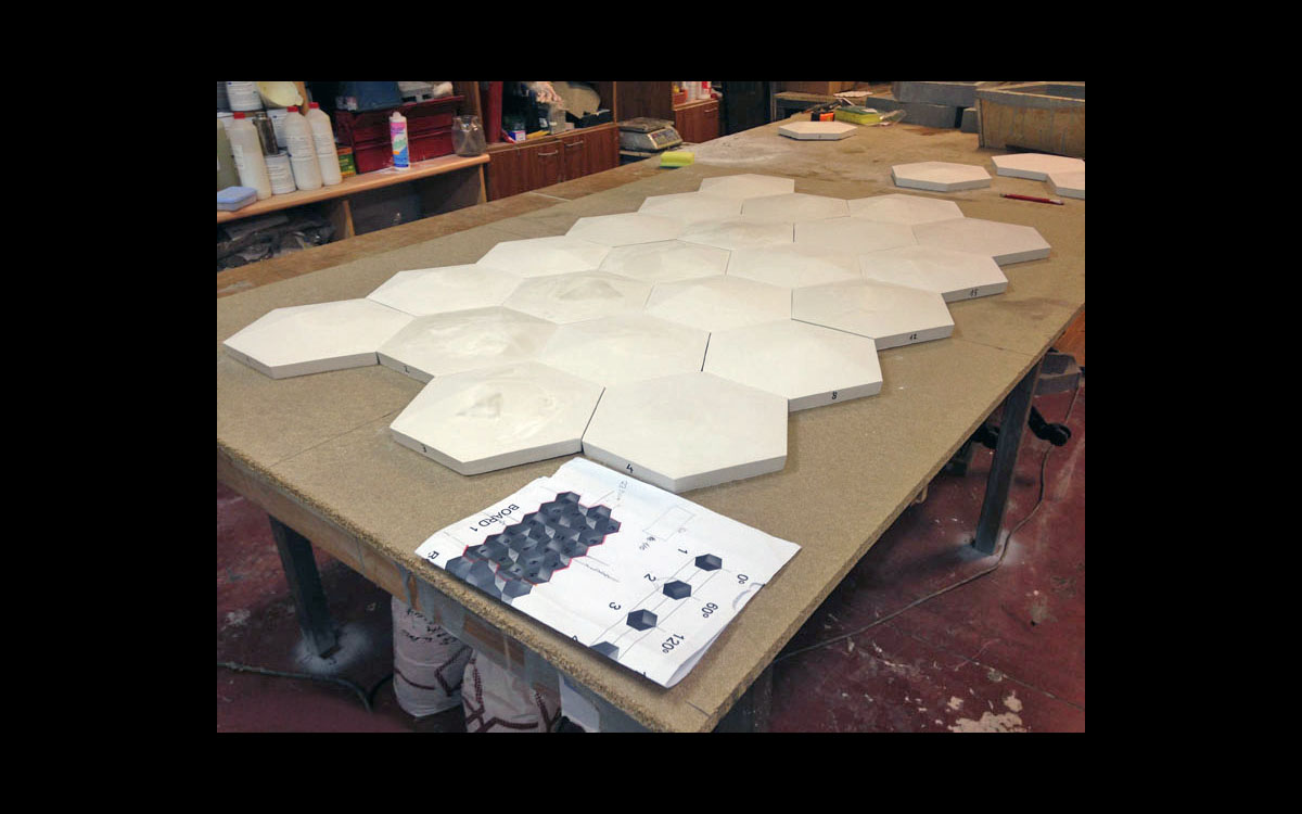 Mock Up de revestimiento GRC de estaciones de metro linea Gold en Doha. El fin es recrear sensación de agua.